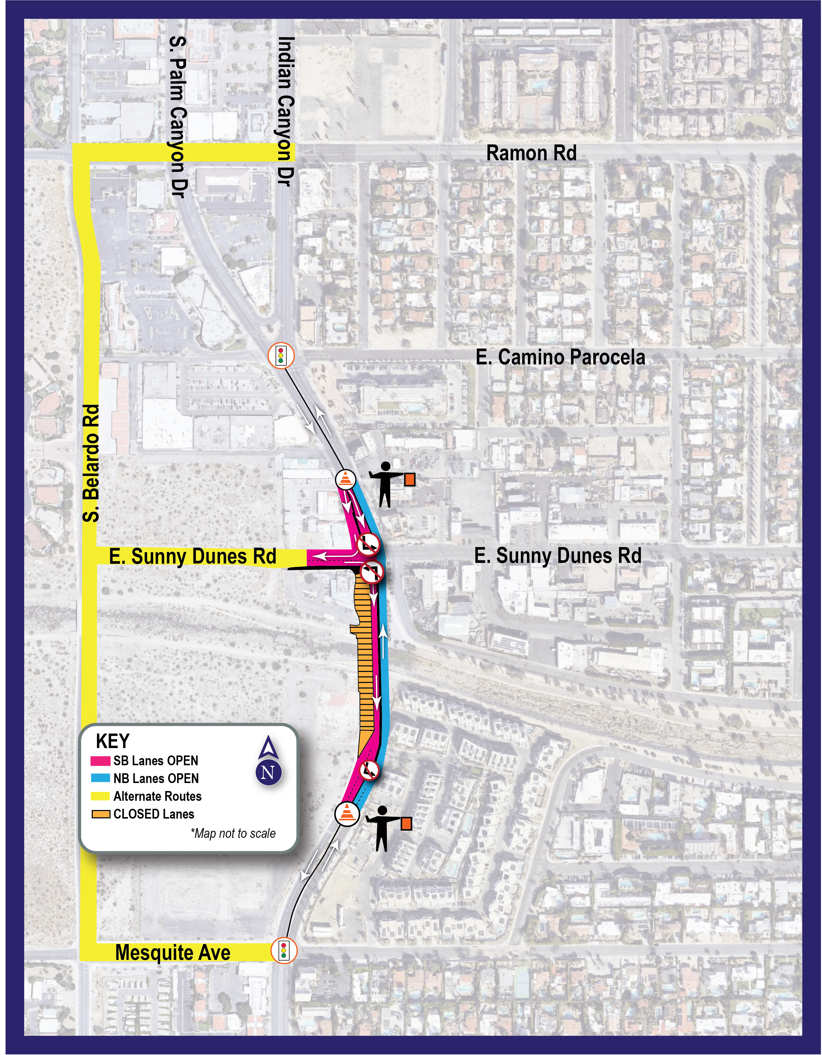 Flaggers will intermittently stop and hold traffic along S. Palm Canyon Drive between E. Camino Parocela and Mesquite Avenue to allow crews to safely deliver and place 90-foot-long bridge beams.