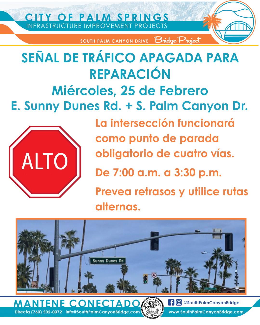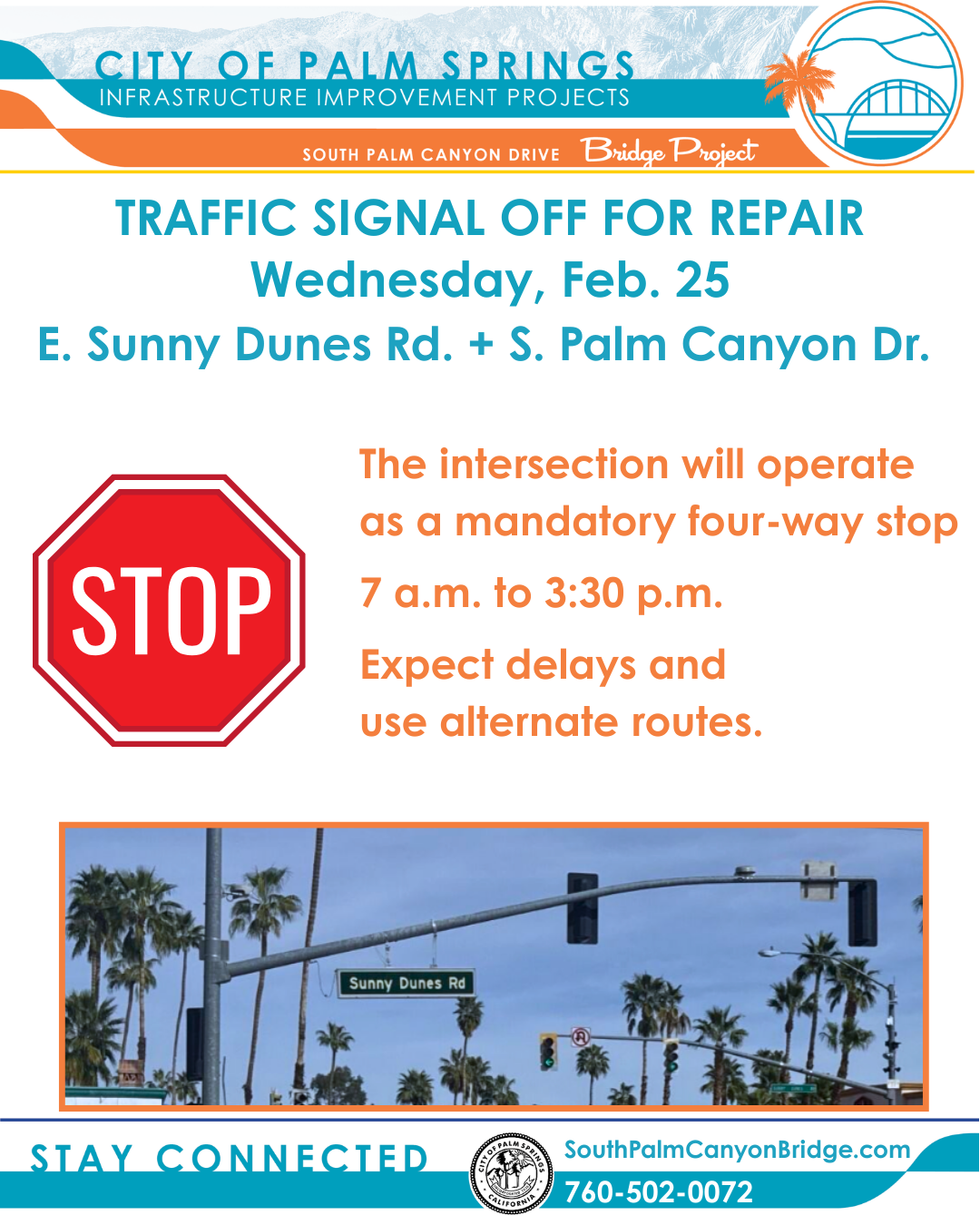 Maintenance crews will perform repairs on the traffic signal at the intersection of E. Sunny Dunes Road and S. Palm Canyon Drive on Wednesday, Feb. 25.