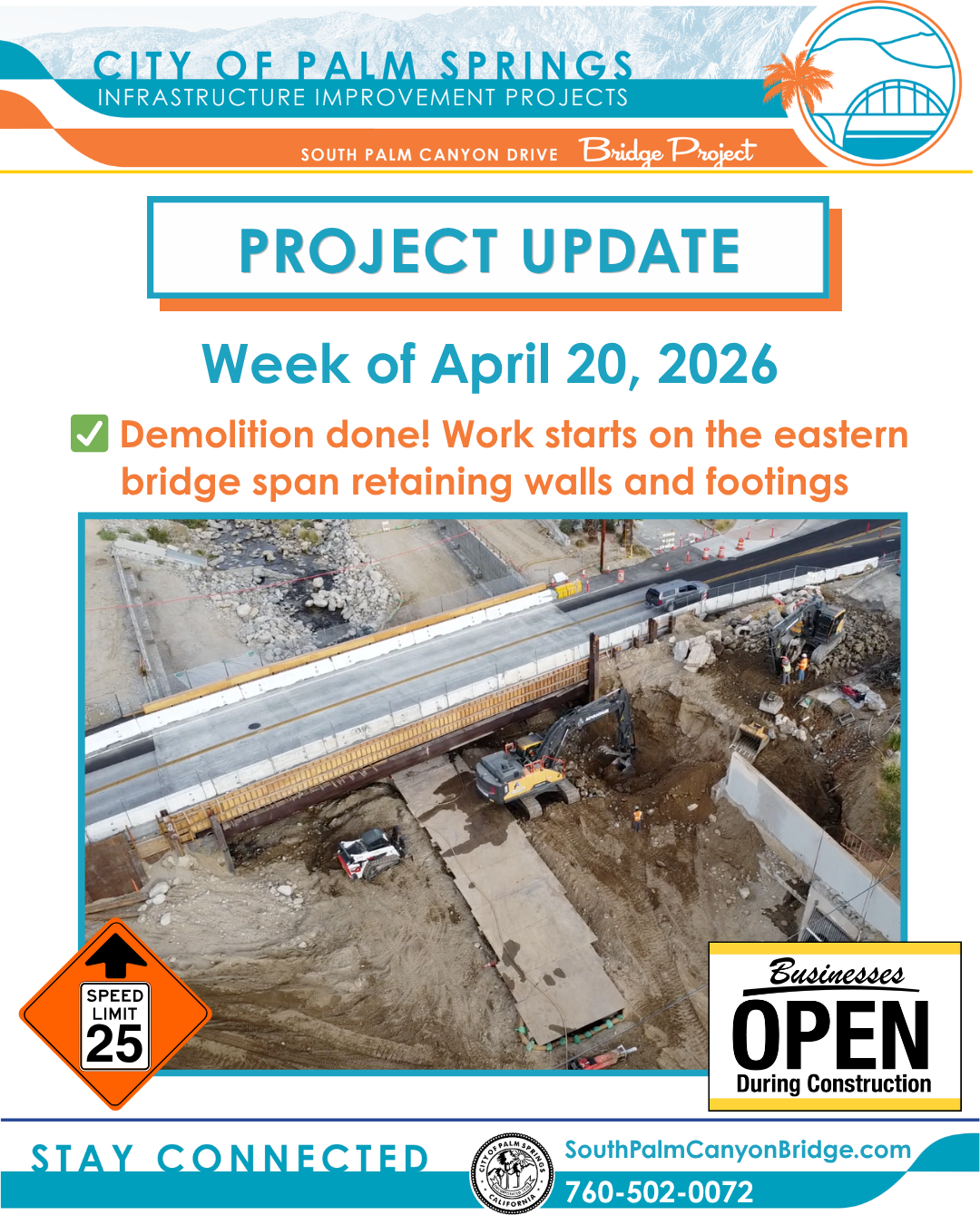 Crews are starting work on the eastern bridge span retaining walls and footings that will support the new South Palm Canyon Bridge.