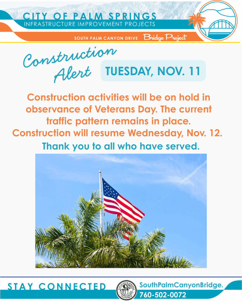 In observance of Veterans Day, there will be no construction activities on Tuesday, Nov. 11. The current traffic pattern will remain in place during this time.